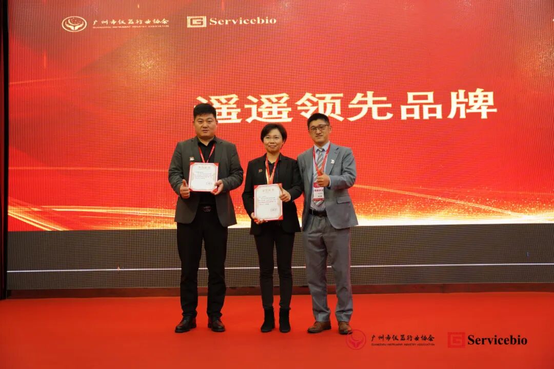 为表示对总冠名商的感谢,广州市仪器行业协会会长陈义康授予武汉赛维尔生物科技有限公司总监汪涛年会总冠名赞助单位牌匾。